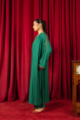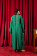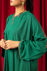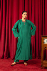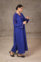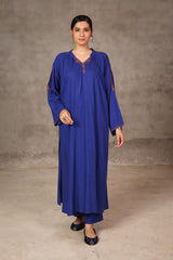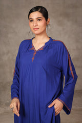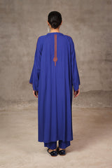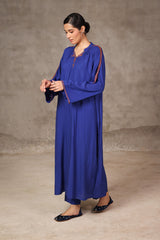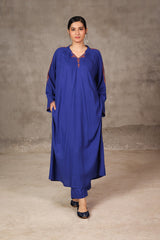 This long-length loose kurta excudes elegance with its band neckline, gathers around it, and wide open sleeves. The contrasting intricate dori embroidery on V-neckline , sleeves hem , shoulders and back adds a sophisticated look.
