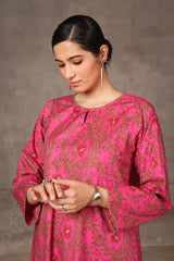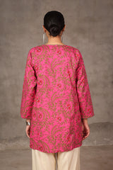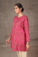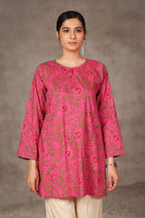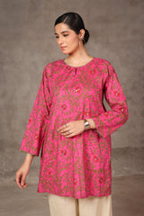 A printed, short-length, panaled shirt featuring round neckline with a keyhole style, embellished with minimal embroidery on neckline and sleeves.