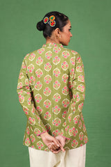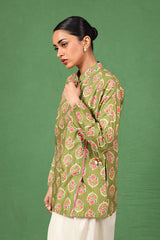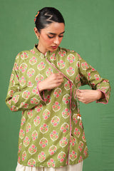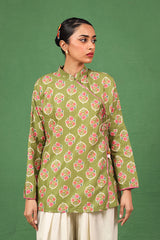 A subtly printed top featuring a band collar neckline in an asymmetrical style, adorned with buttons and piping detailing along the neckline. The piping detail extends to the sleeve hems, adding a refined touch to the overall look.