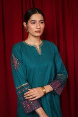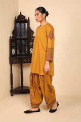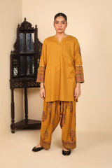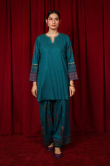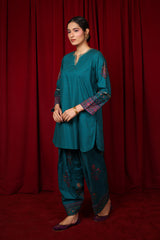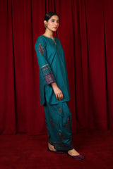 This cordset features embroidered boarders and motifs on sleeves with a round neckline and v slit adorned with intricate embroiderey .The plain kurta paired with pegged shalwar, embroidered with floral motifs and boarders giving all traditional vibes.