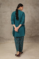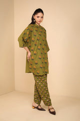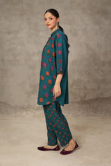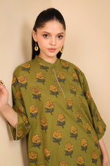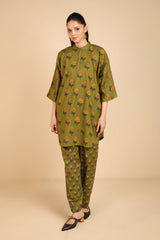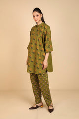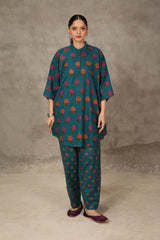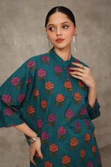 A loose fit printed tunic with band neckline and rounded shirt corners, featuring fish stitch details on neckline and sleeve hems along with buttons along the front. Paired with matching printed shalwar.