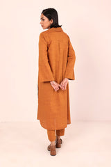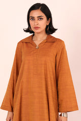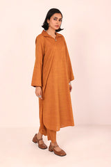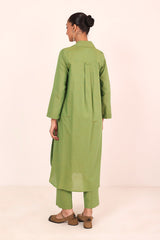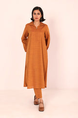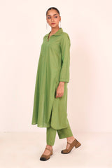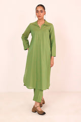 A two tone base colared fitted shirt with flared sleeves and rounded shirt corners. Paired with straight fit trousers.