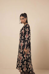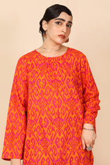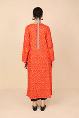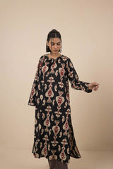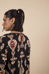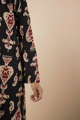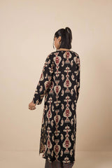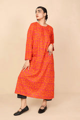 A loose fit printed kurta with rounded neckline, featuring ruching details at the neckline.