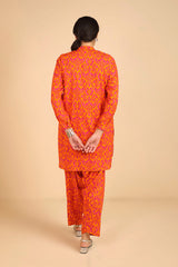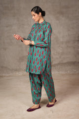 An ikat-inspired, medium-length printed shirt with band neckline and buttons on planket. Another detail includes straight-cuff sleeves. Paired with matching fit shalwar.