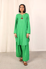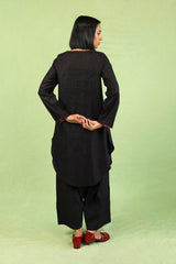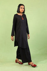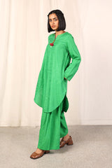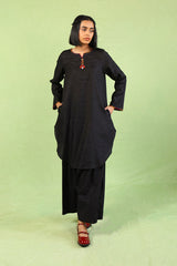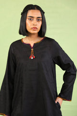 A loose fit kurti with round corners and round neckline with V slit, featuring jacquard prints and multicolour fish stitch details on neckline and sleeve hem, along with tassels at the front and side pocket detail. Paired with matching culotte pants.