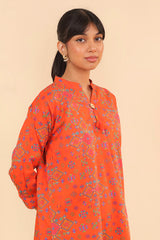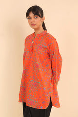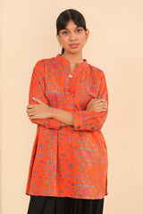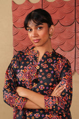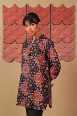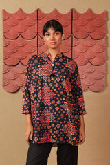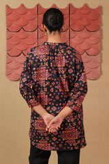 A classic loose-fit short-length printed shirt with a band neckline, embellished with tassel and button on it. It features straight cuffed sleeves.