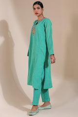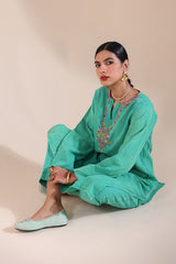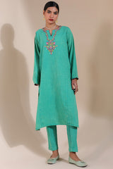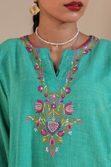 Classic-fit embroidered paneled shirt with a round neckline and v-slit, adorned with delicate embroidered detail. Paired with classic straight-fit trousers for a balanced, elegant look.
