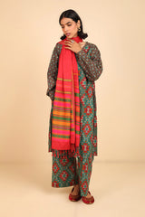 A vibrant woven shawl with color-blocked borders and loose thread edges for a rustic touch.