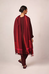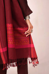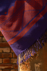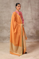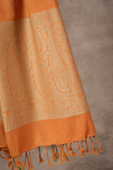 A shawl featuring pashmina design with elegant zari boarders and loose threads along the edges, adding a delicate touch to its overall look.