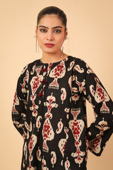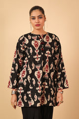 Printed kurti with buttons and tassel details on neckline.