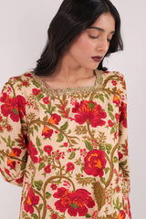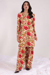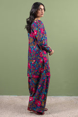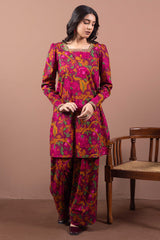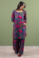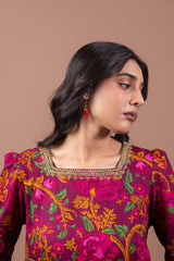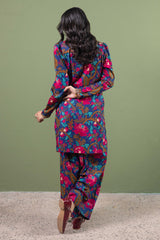 A classic-fit printed shirt with a square neckline, adorned with delicate embroidery on the neckline and sleeve hems. Paired with matching printed farshi shalwar featuring stitching detail on the ankle hemline.
