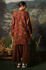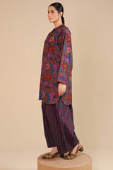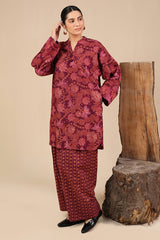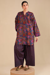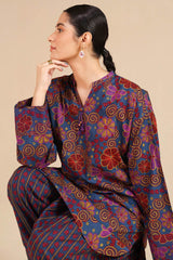 A classic-fit printed shirt with a low band and V-neckline, enhanced with tassel detailing. Side pockets add functionality and ease, while delicate stitching accents the sleeve borders. Paired with a complemented classic farshi shalwar, finished with detailed stitching along the borders.