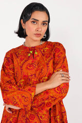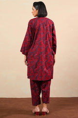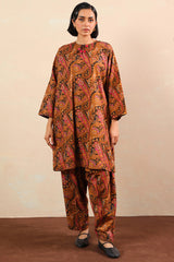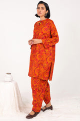 A vibrant printed relaxed-fit shirt with a round neckline and V-slit, adorned with tassel detailing. Designed with side pockets for functionality and ease. Paired with matching printed classic-fit shalwar for a coordinated, stylish look.