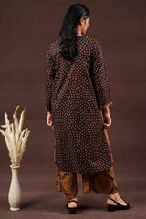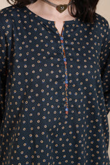 A classic-fit printed shirt with a round neckline and V-slit, adorned with delicate mirror accents along the placket. Paired with matching culottes for a balanced, contemporary ensemble.