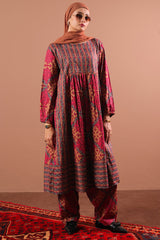 Shyrdak-printed flared frock with a round neckline. Gathers at the waist add a graceful flare to the silhouette. Cinched sleeves complete the look. Paired with matching printed classic-fit shalwar.