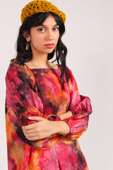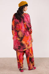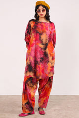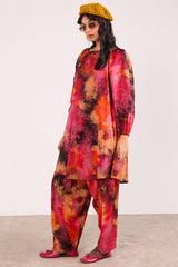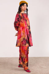 A vibrant, splashy printed relaxed-fit shirt with a square neckline. Puff sleeves finished with a cinched detail.. Paired with matching printed classic-fit shalwar.