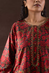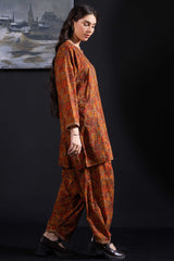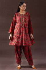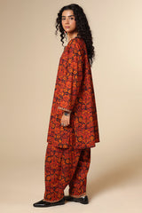 A classic-fit printed shirt with a round neckline and buttons along the front placket, featuring delicate embroidery on the neckline and sleeve hems. Paired with a matching printed classic-fit shalwar, accented with embroidered detailing on the ankle hemline.