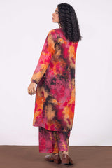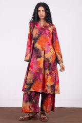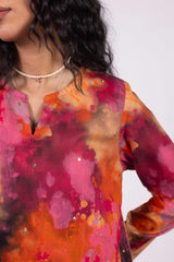 A vibrant, splashy panaled printed shirt with a round neckline and V-slit, featuring scattered mukaish accents. Paired with matching printed culottes for a coordinated look.