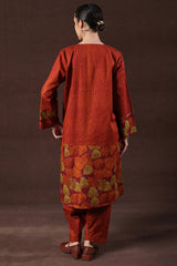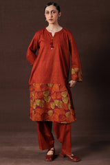 A classic-fit printed shirt with a round neckline and V-slit, adorned with delicate tassel detailing. Paired with matching printed farshi shalwar for a coordinated and stylish look.