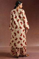 A paisley-printed classic-fit shirt with a round neckline and V-slit, adorned with delicate mukaish work. Paired with printed culottes for a coordinated contemporary finish.