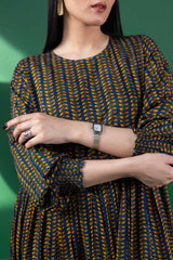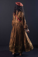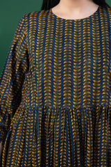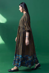 A long, flared printed dress with a round neckline, designed with soft gathers at the waist to accentuate its graceful flare. Gathered sleeve hems add delicate structure and a refined finish.
