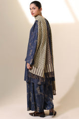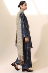 Denim-textured classic-fit printed shirt with a round neckline and V-slit, adorned with tassel detailing. Paired with matching printed culottes.