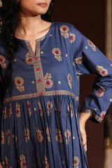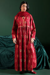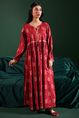 A long flared gold-printed dress with a round neckline and V-slit, adorned with buttons along the front slit. Soft gathers at the empire waist create a graceful, flowy silhouette.