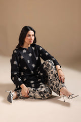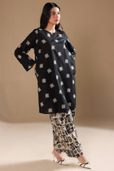 A classic-fit printed shirt with a low band neckline and V-slit, featuring side pockets. Paired with a complementary printed classic-fit shalwar finished with stitching detail along the ankle hem for a touch of understated elegance.