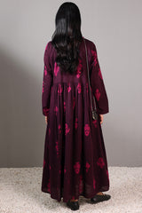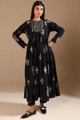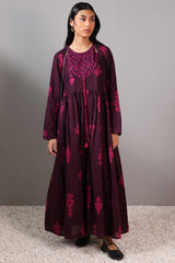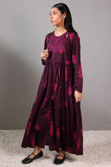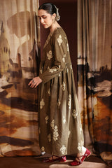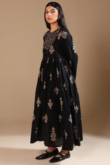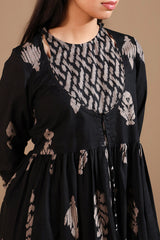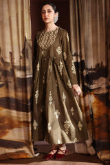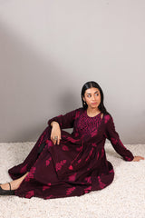 A long, flared printed dress with a round neckline and tassel detailing, gathered around the empire waist for a graceful flare.