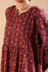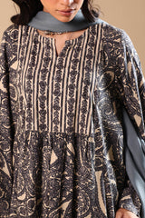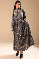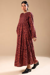 A long flared printed dress with a round neckline and V-slit. The bodice is adorned with delicate stitching details, while gathers around the empire waist create a graceful, flowy silhouette.