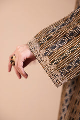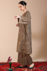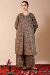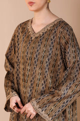 A paneled printed shirt with a V-neckline, adorned with delicate embroidered detailing along the neckline and sleeve hems. Paired with matching printed straight-fit trousers.