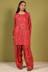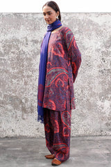 A classic-fit vibrant printed shirt with a round neckline adorned with mukaish detailing. Paired with a matching printed farshi shalwar featuring fine stitching along the borders.