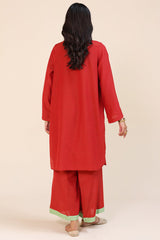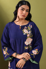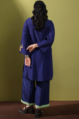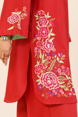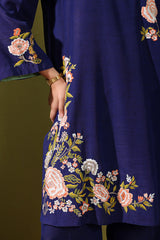 Classic-fit embroidered shirt with a round neckline and V-slit, adorned with pearl detailing. Rounded hem for a graceful finish. Paired with solid culottes for a timeless, classic look.