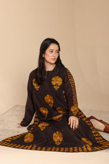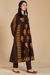 Embroidered paneled shirt with a round neckline, adorned with delicate pleat detailing and buttons along the front slit. The neckline and sleeve hems are finished with refined stitching details. Paired with classic straight-fit trousers.