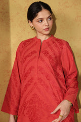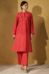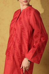 Embroidered classic-fit shirt with a low band neckline, adored with delicate stitching accents. Paired with classic culottes for a clean, refined look.
