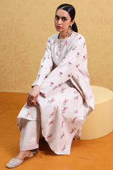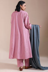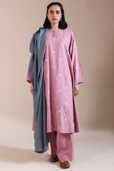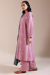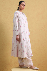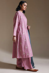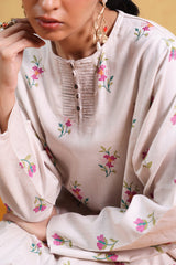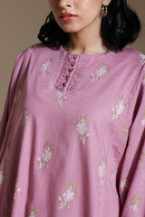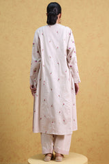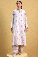 Embroidered paneled kurta with a round neckline adorned with pleated detailing and buttons along the front slit. Paired with a classic-fit shalwar for a sophisticated look.