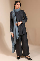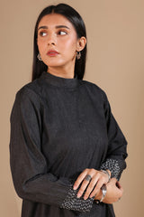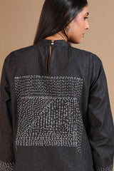 Denim short shirt with a low band neckline and keyhole detail at the back. Delicate thread-stitched patterns grace the back and sleeve hems, paired with classic culottes for a refined everyday look.