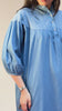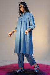 Relaxed-fit A-line shirt with a low band neckline and buttoned placket, adorned with delicate stitching detail on the front and back bodice. Finished with lantern sleeves and paired with straight-fit trousers.