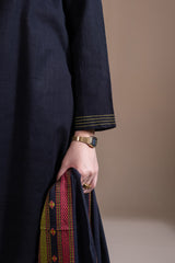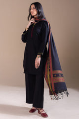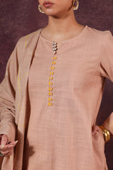 A classic-fit shirt with a round neckline, adorned with colorful loop detailing along the front slit. Designed with side pockets, a rounded hem, and fine stitching on the sleeve hems. Paired with culottes and styled with a jacquard dupatta featuring delicate frill detailing along the edges.