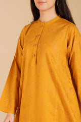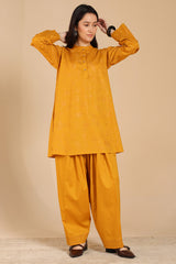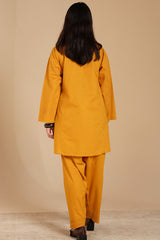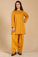 Embroidered classic-fit paneled kurta with a low band neckline and a buttoned front placket. Paired with a classic-fit shalwar, finished with embroidered detailing at the ankle hemline.