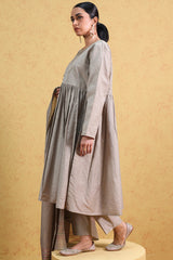 Embroidered classic-fit flared Anarkali-style frock adorned with bead embellishments on the bodice and delicate embroidery throughout. Paired with straight-fit trousers and finished with a lurex bordered dupatta for a festive look.