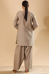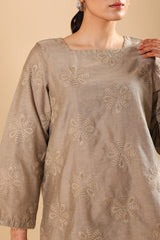 Embroidered classic-fit shirt with a square neckline, adorned with delicate embroidered detailing along the neckline and sleeve hems. Paired with a classic farshi shalwar, finished with refined stitching details along the borders.