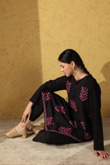 Embroidered classic-fit shirt with a round neckline and V-slit, adorned with delicate tassel and stitching details along the neckline, and subtle stitch accents on the sleeve hems. Paired with straight-fit trousers.