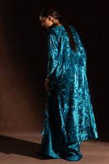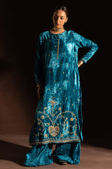 Luxurious crushed velvet classic-fit shirt with a round neckline, adorned with rich embroidery and delicate gota detailing along the front slit. Paired with matching velvet culottes for an elevated festive look.