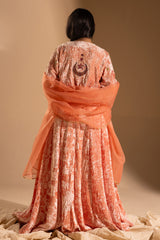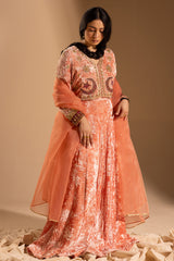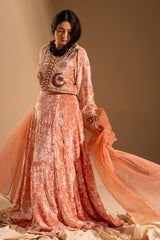 Luxurious crushed velvet embroidered blouse, detailed with loop buttons along the front slit and delicate embroidery enhanced with subtle gota detailing. Paired with a generously flared Lehnga for graceful movement. Styled with an organza dupatta finished with scattered sequin accents and delicate lace detailing along the edges for an elevated festive look.