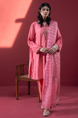 Embroidered classic-fit paneled shirt with delicate embroidery on the neckline and sleeve hems, enhanced with subtle bead embellishment and finished with lace detailing. Paired with a classic pegged shalwar with button detailing along the side slit, and completed with a lurex organza dupatta finished with lace detailing.