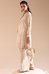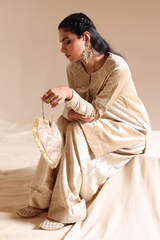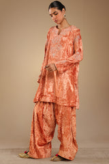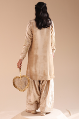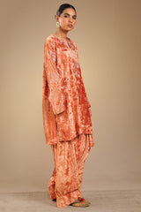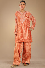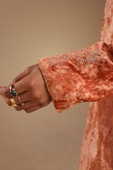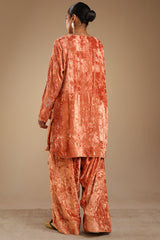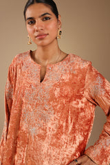 Embroidered crushed velvet classic-fit shirt with a round neckline and V-slit, designed with relaxed shoulders. Paired with a matching velvet farshi shalwar with stitching detail.