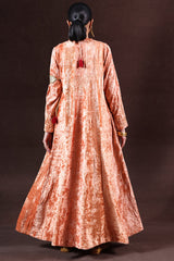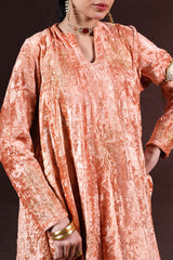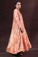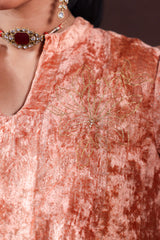 Velvet-rich long flared dress adorned with delicate embroidered motifs throughout and along the sleeve hems for a refined festive vibe. Designed with a low band neckline and a U-shaped neckline, paired with velvet classic straight-fit trousers.