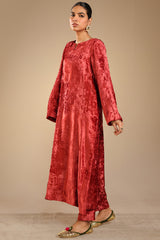 Rich crushed velvet relaxed-fit classic shirt with a round neckline and V-slit. Paired with crushed velvet straight-fit trousers.