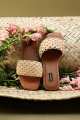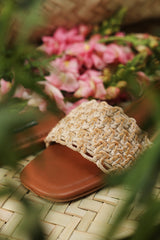 Premium leather chappals featuring a smooth tan base and a handwoven textured strap for a bold yet minimal look. Crafted with a durable sole and clean finishing, offering everyday comfort with style.